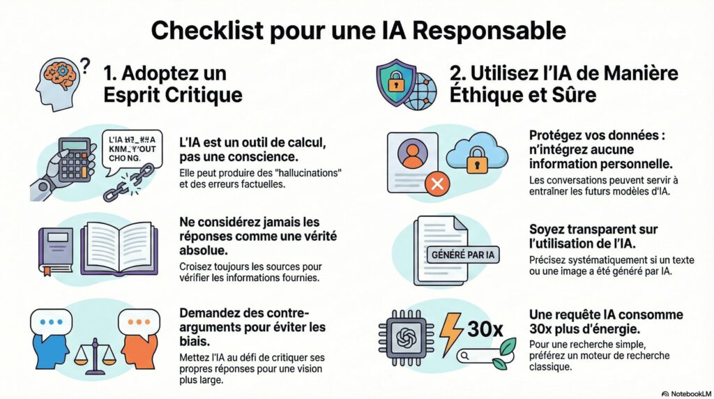 Maintenant qu’on a mis en exergue les risques liés à l’usage de l’IA générative, voici une checklist pour l’exploiter de façon plus responsable (infographie générée à l’aide de l’outil NotebookLM) :
